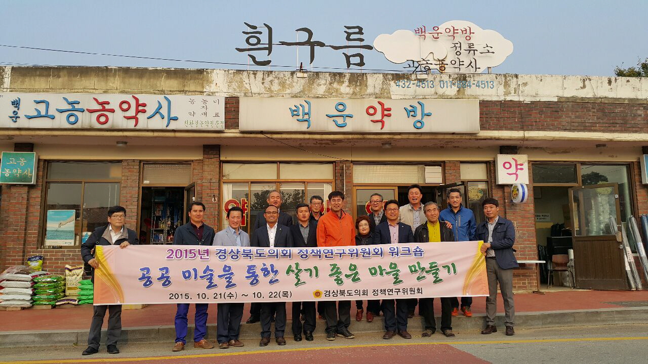 경상북도의회 정책연구위원회(위원장 도기욱)는 10월 21일 지역대학과 지역주민들이 힘을 합쳐 아름다운 간판 만들기로 농촌마을 재생사업에 성공한 전북 진안의 원촌 마을 현장을 둘러보고 『공공 미술을 통한 살기 좋은 마을 만들기』주제로 전북 남원에서 워크숍을 개최했다.