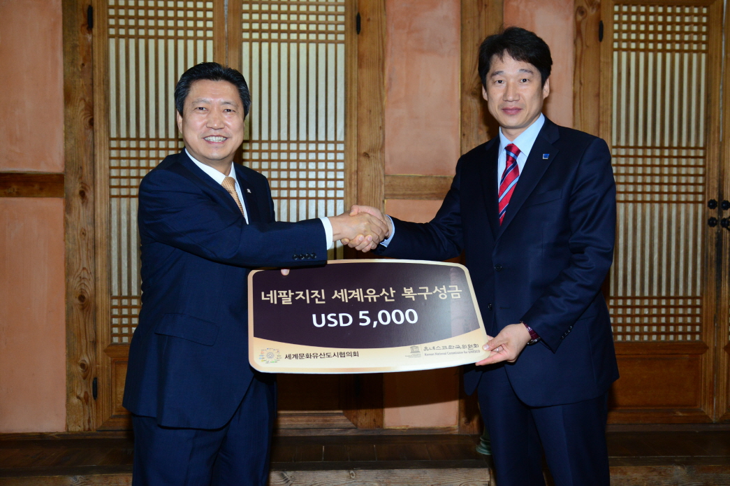 세계문화유산도시협의회(회장, 경주시장 최양식)에서는 지진으로 세계유산의 일부가 소실된 네팔지역에 복구 성금 5,000불(한화 5,660천원 정도)을 유네스코 한국위원회를 통해 기탁했다.