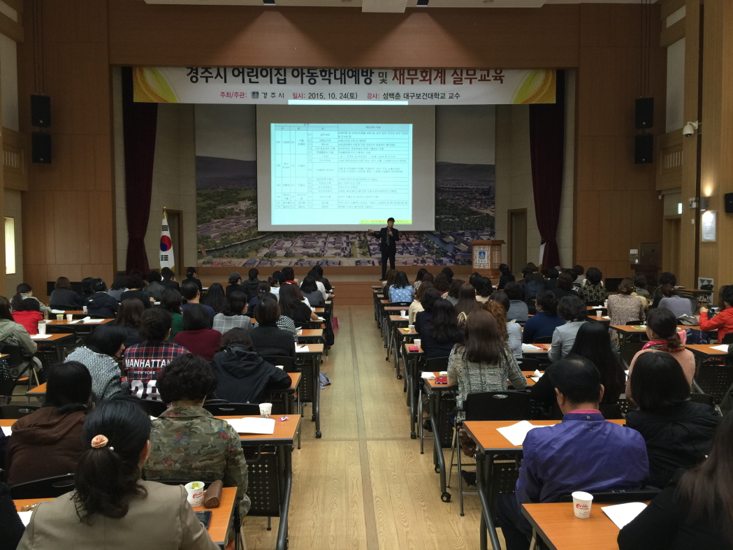 실무교육에는 경주시의 어린이집 원장 및 실무자 160여명이 참석한 가운데 대구보건대학교 성백춘 교수(회계학 박사)를 초빙하여 실무 강의를 했다.