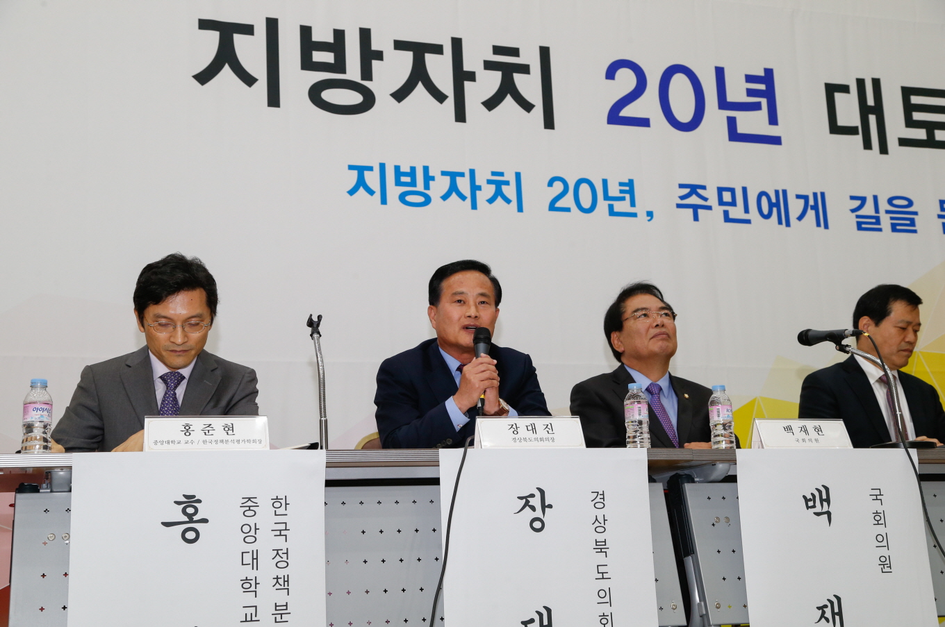 경북도의회 장대진의장은 10월 29일 제3회 지방자치의 날 기념행사의 일환으로 열린「지방자치 20년 대토론회」에서 현재의 비정상적인 지방자치제도를 조속히 바로 잡아야 한다고 역설했다.