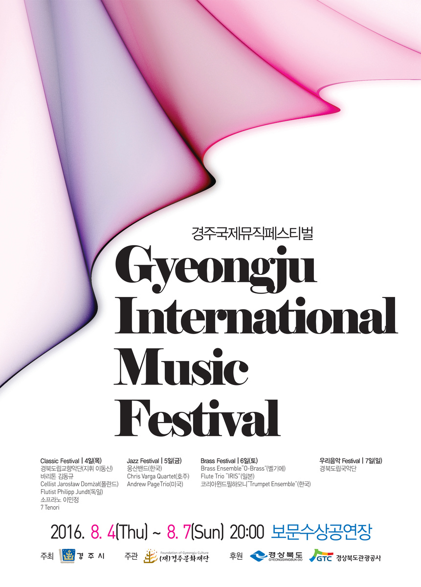 ‘2016 경주국제뮤직페스티벌’은 클래식, 재즈, 관악, 국악 등 다양한 장르가 어우러진 종합 음악제로 국제적인 관광도시 경주에 걸맞게 7개국 정상급 뮤지션들이 대거 참여하여 경주보문수상공연장에서 무료로 열릴 예정이다.