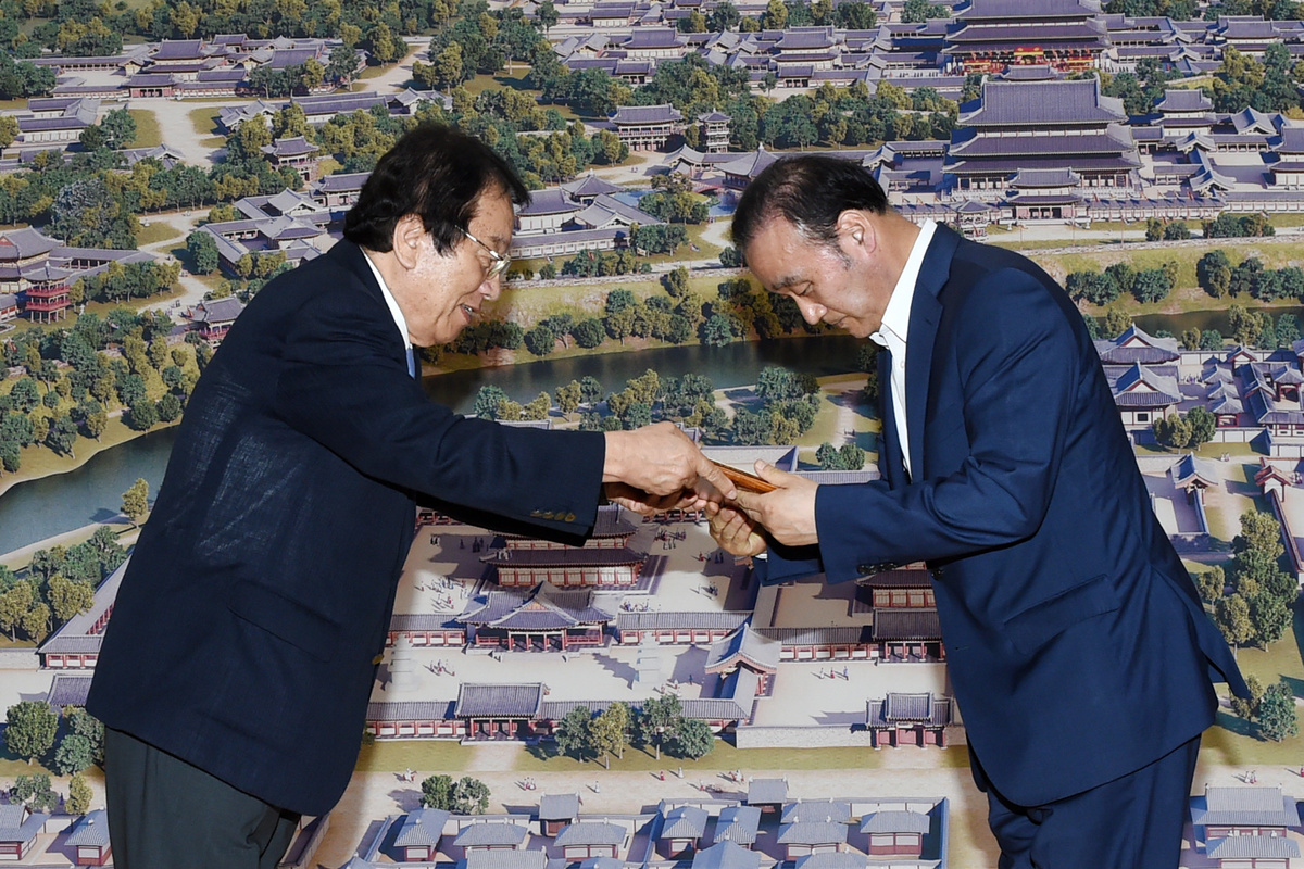 | ↑↑ 최양식 경주시장(오른쪽)에게 이순탁 세계물포럼국제운영위원장이 대신하여 표창패를 전수하고 있다. |