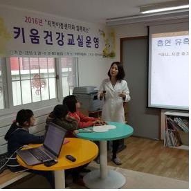 관내 25개소 아동센터 중에서 원거리지역에 있는 미래의 꿈나무들에게 질 높은 건강프로그램을 제공하기 위해 보건소 인력 간호사를 비롯해 각 분야 4명의 전공자들을 투입, 매주 1시간 동안 신체운동과 영양, 구강, 금연, 절주 등 다양한 보건교육 실시와 위덕대학교 급식지원센터와 연계한 건강한 간식 만들기 실습 등을 병행하여 10주간 운영했다.