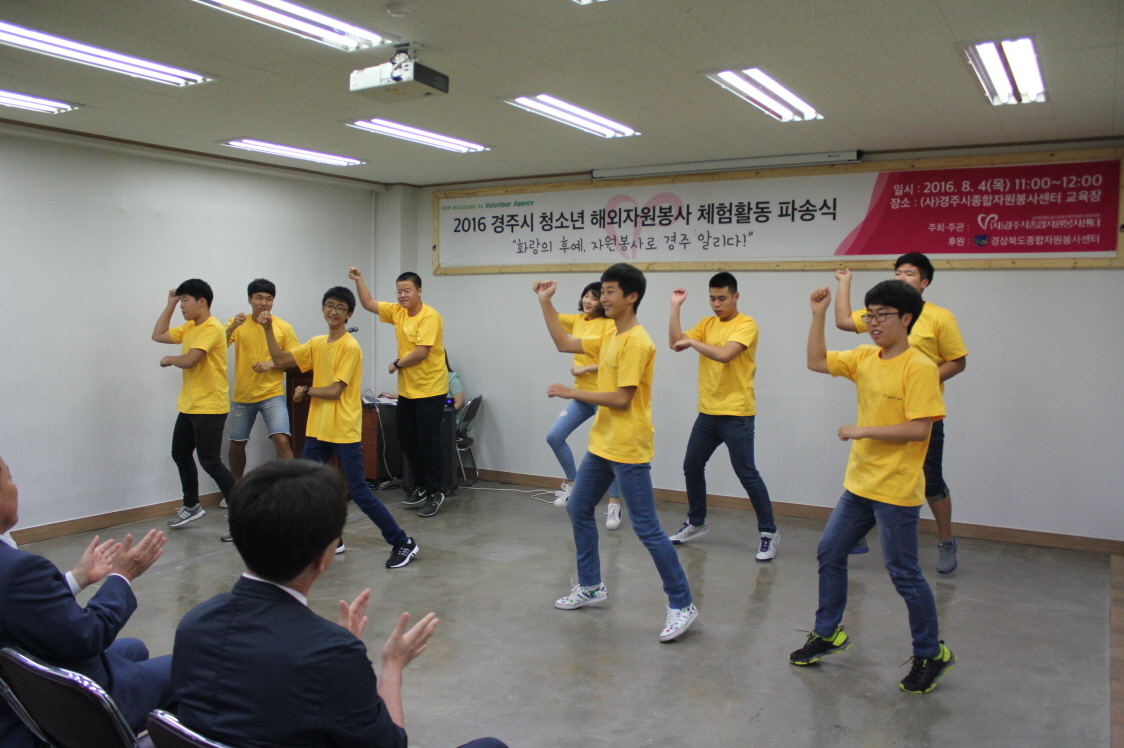 이날 파송식에는 청소년과 보호자, 리더 자원봉사자, 경주시자원봉사단체연합회, 자원봉사할인가맹점 대표 등이 참석하였으며, 사업취지 설명과 참가 청소년들의 문화교류 공연을 선보여 지금까지의 준비과정과 해외봉사 활동을 다짐하는 시간이 되었다.