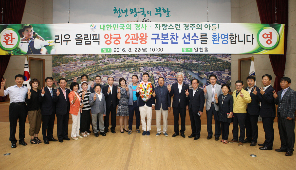 [이재영 기자]= 경주시와 경주시체육회는 22일 시청 알천홀에서 지난 6일부터 22일까지 17일간 ‘모두의 열정, 리우를 향해’ 라는 슬로건으로 지구촌을 뜨겁게 달구었던 2016 리우올림픽에서 양궁 2관왕으로 대한민국과 고향 경주시의 명예를 더욱 더 빛낸 ‘구본찬’ 선수의 환영행사를 개최했다.