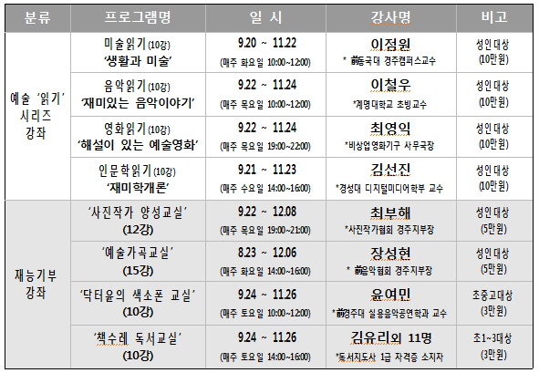 하반기 예술아카데미는 오는 23일에 개강하는 예술가곡교실을 제외하고는 모두 추석 연휴 후에 개강한다. 경주예술의전당 홈페이지를 방문하여 강좌 세부내용을 숙지한 후 신청하면 된다. 예술 ‘읽기’ 시리즈의 경우, 기존 수강생은 수강료 2만원 할인혜택을 받을 수 있다.