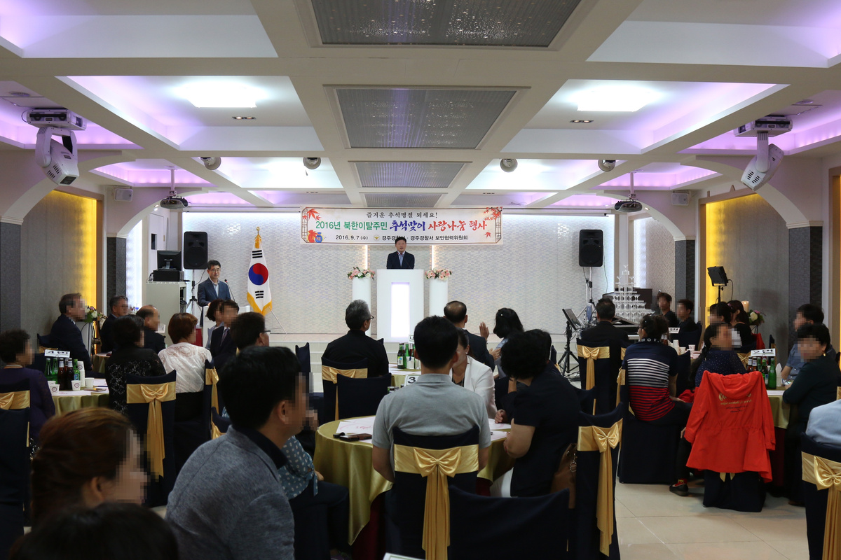 [이재영 기자]= 경주경찰서(서장 정흥남)는 보안협력위원회(위원장 조남립)와 함께 지난 7일(수) 오후 6시 30분 경주 웨딩파티엘에서 ‘북한이탈주민을 위한 추석명절 사랑나눔 행사’를 개최 북한이탈주민·보안협력위원. 경주시청. 경주제일교회. 민주평화통일자문회의경주시협의. 민족통일경주시협의회. 하나센터 등 80여명이 참석하여, 북한이탈주민들의 고향과 가족에 대한 그리움을 달래고 용기를 북돋아주는 자리를 마련했다.