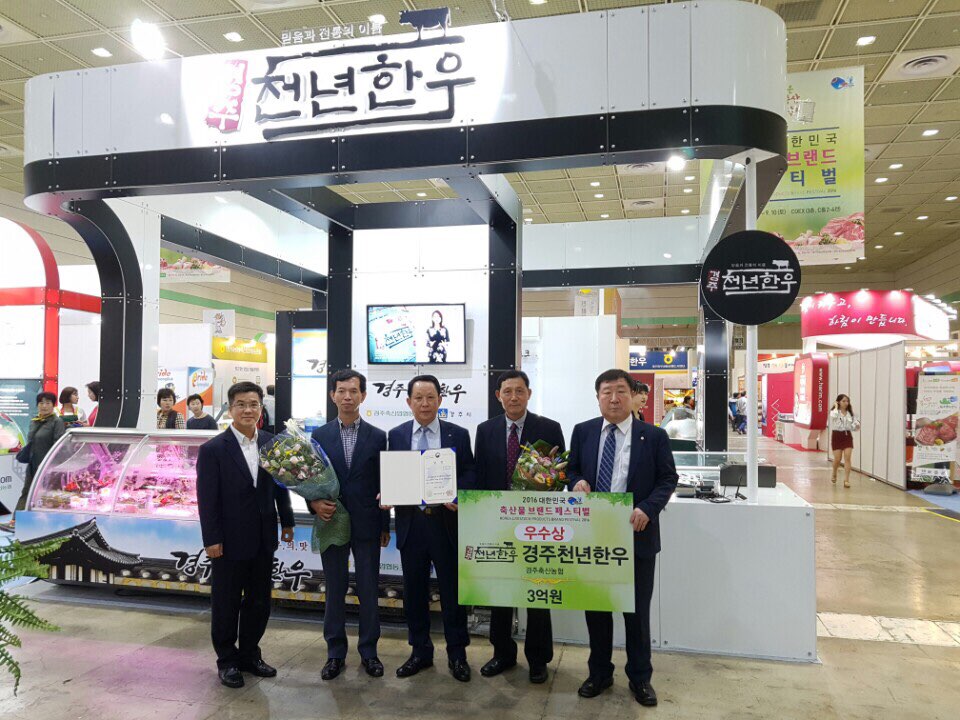 [이재영 기자]= 경주시 대표 한우브랜드 경주천년한우가 8일 서울 코엑스에서 열린 ‘2016 대한민국 축산물 브랜드 페스티벌’ 축산물브랜드 경진대회에서 농림축산식품부장관상을 수상하고, 부상으로 무이자 축산경영종합자금 3억원을 받았다.