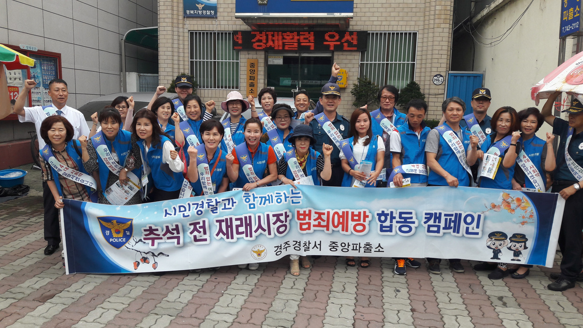 [이재영 기자]= 경주경찰서(서장 정흥남)에서는 지난 7일(수) 중앙시장(아랫시장)에서 시민경찰과 함께 추석 명절을 맞아 차례 상을 보기위해 전통시장을 찾는 주부와 노약자의 지갑을 노리는 소매치기 등 각종 범죄예방을 위한 홍보 캠페인을 실시했다.