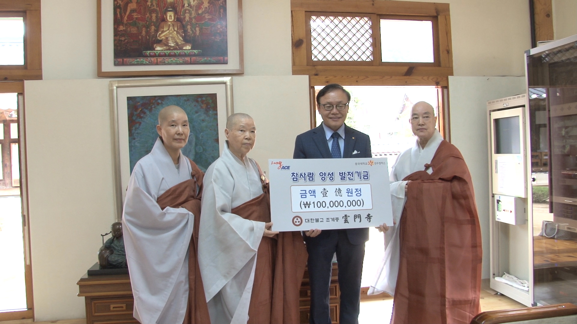 명성스님은 운문사승가대학 학장 일진스님, 운문사 주지 진광스님과 학인스님들과 함께 동국대학교 경주캠퍼스 참사람 양성 발전기금으로 1억원을 이대원 동국대 경주캠퍼스 총장에게 전했다.