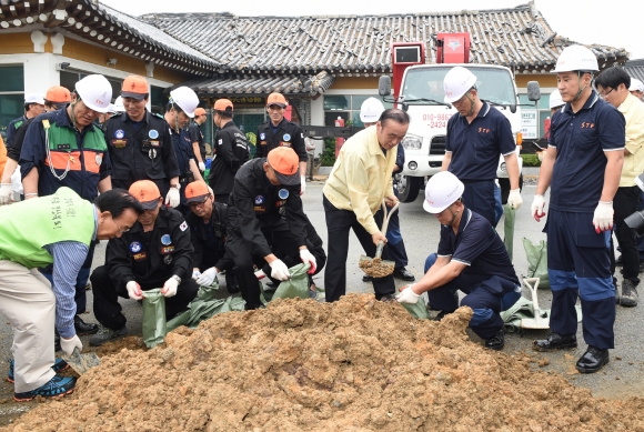 응급복구에 함께한 김석기 의원, 김관용 지사, 최양식 시장은 “지금으로선 제16호 태풍의 직․간접 영향이 가장 우려가 된다며, 파손된 지붕 및 담장, 문화재, 저수지 등에 우선 비 가림 방지 조치로 제2의 없도록 예방조치를 하였으며, 앞으로 축산농가 가축 피해 등이 있는지도 면밀히 조사를 하겠다며, 모든 가용자원을 총 동원하여 빠른 시일 내 정상회복 될 수 있도록 중앙․관계기관과 지원금 건의 등 모든 조치를 강구하겠다"며 응급조치에 참여해 준 모든 분들께 감사를 전했다.