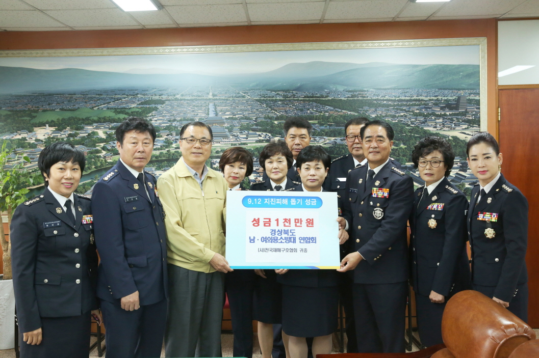[이재영 기자]= 경주시는 30일 경북도 남․여 의용소방대연합회(회장 남구중, 김묘라)에서 9.12 지진의 빠른 복구 등을 위해 경주시청을 방문해 성금 1천만 원을 전달했다고 밝혔다.