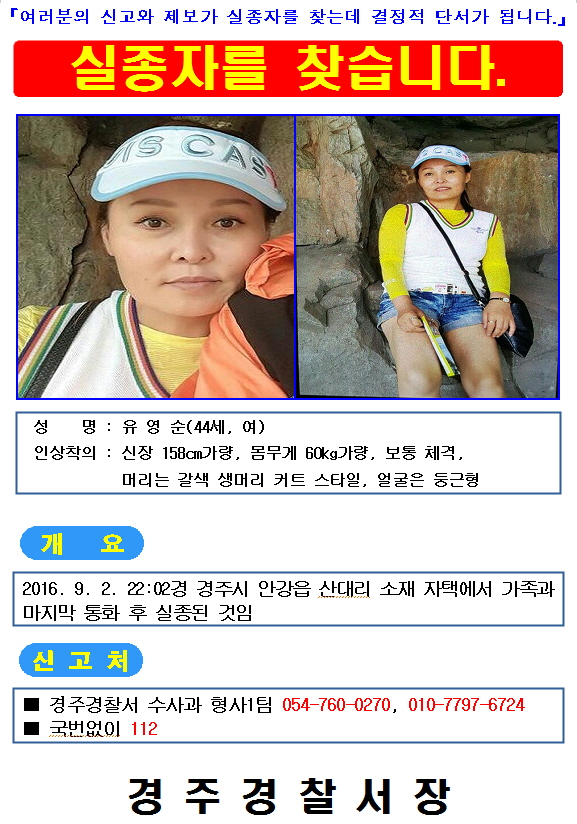 [이재영 기자]= 경주경찰서(서장 정흥남)는 지난 9월 2일 경주시 안강읍에 거주하는 유씨(女, 44세)가 실종되어 수사 중이다.