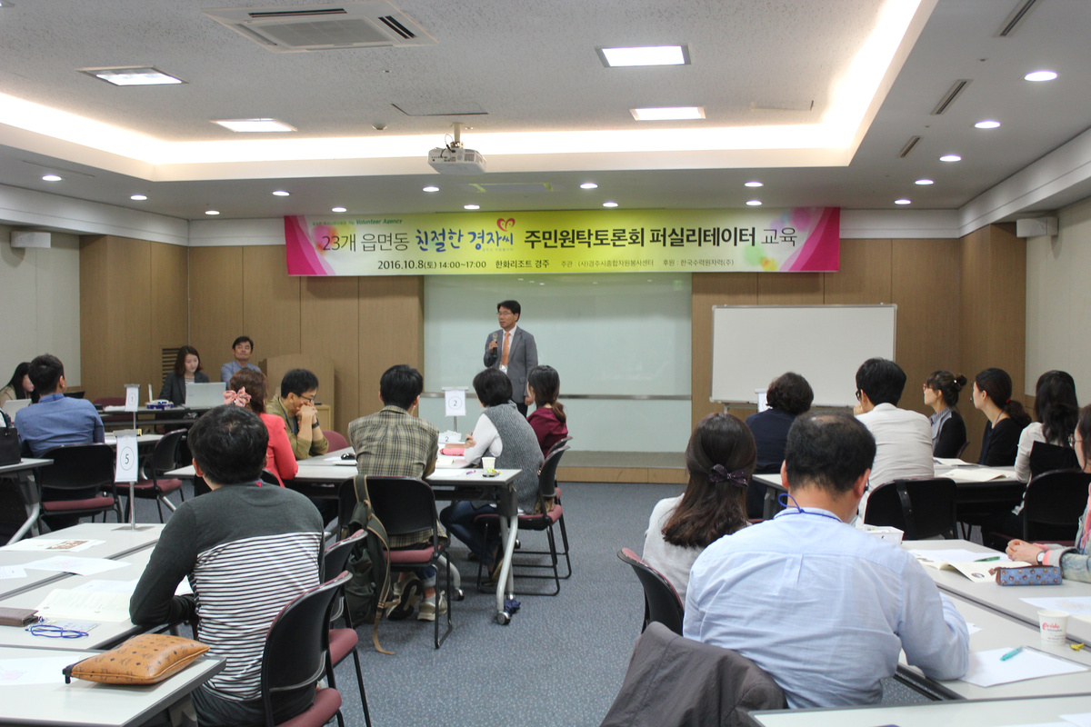 [이재영 기자]= (사)경주시종합자원봉사센터는 8일 자원봉사자 40여명을 대상으로 ‘23개 읍면동 친절한 경자씨 주민원탁토론회 퍼실리테이터 사전 워크숍’을 가졌다.