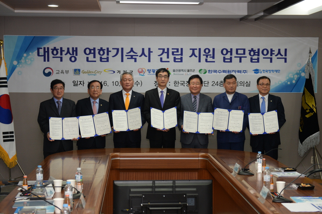 한수원은 12일 한국장학재단 서울사무소에서 교육부 부총리, 한수원 사장, 경주부시장, 울주부군수, 기장군수, 영광군수 등 원전소재 지자체장 및 지역 국회의원 등이 참석한 가운데 ‘재경대학생 기숙사 건립을 위한 업무협약’을 체결하였다고 밝혔다.