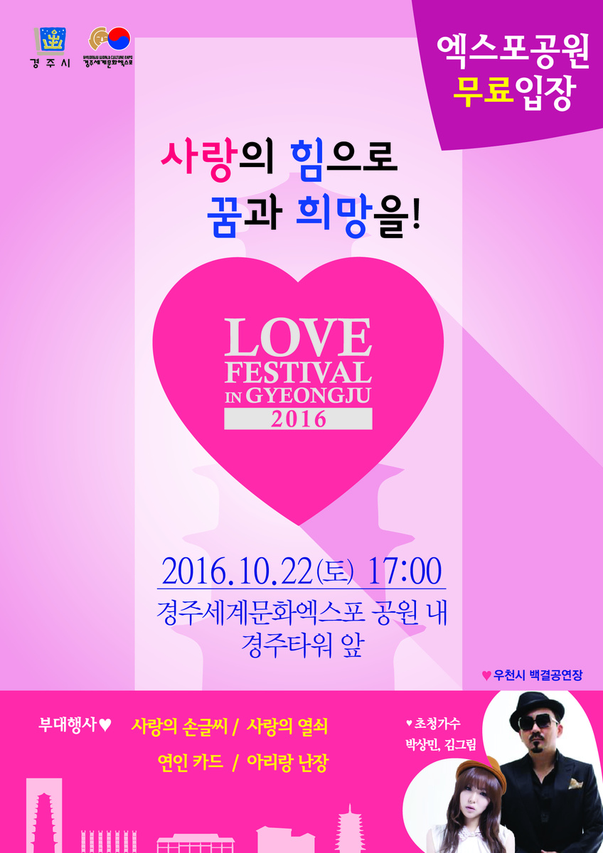 이번에는 'LOVE FESTIVAL IN GYEONGJU 2016' 주제로 경주엑스포 대표공연인 ‘플라잉’ 쇼케이스를 시작으로 연인들과 다문화 부부 등이 참여하는 러브퍼즐 세레모니, 하트벌룬 세레모니 등이 펼쳐져 행사의 분위기를 돋운다.