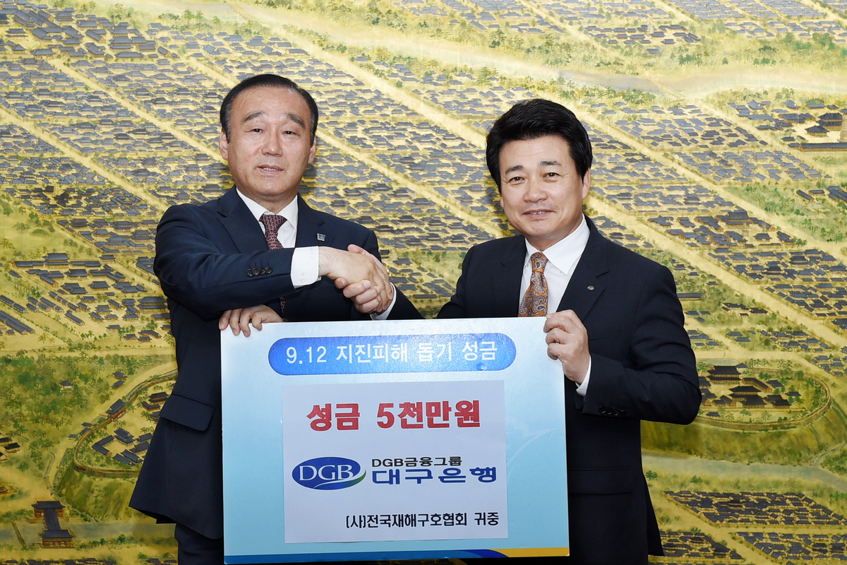 [이재영 기자]= 경주시는 대구은행(은행장 박인규)에서 20일 시를 방문하여 지진피해 복구성금으로 5천만원을 기탁했다고 밝혔다.