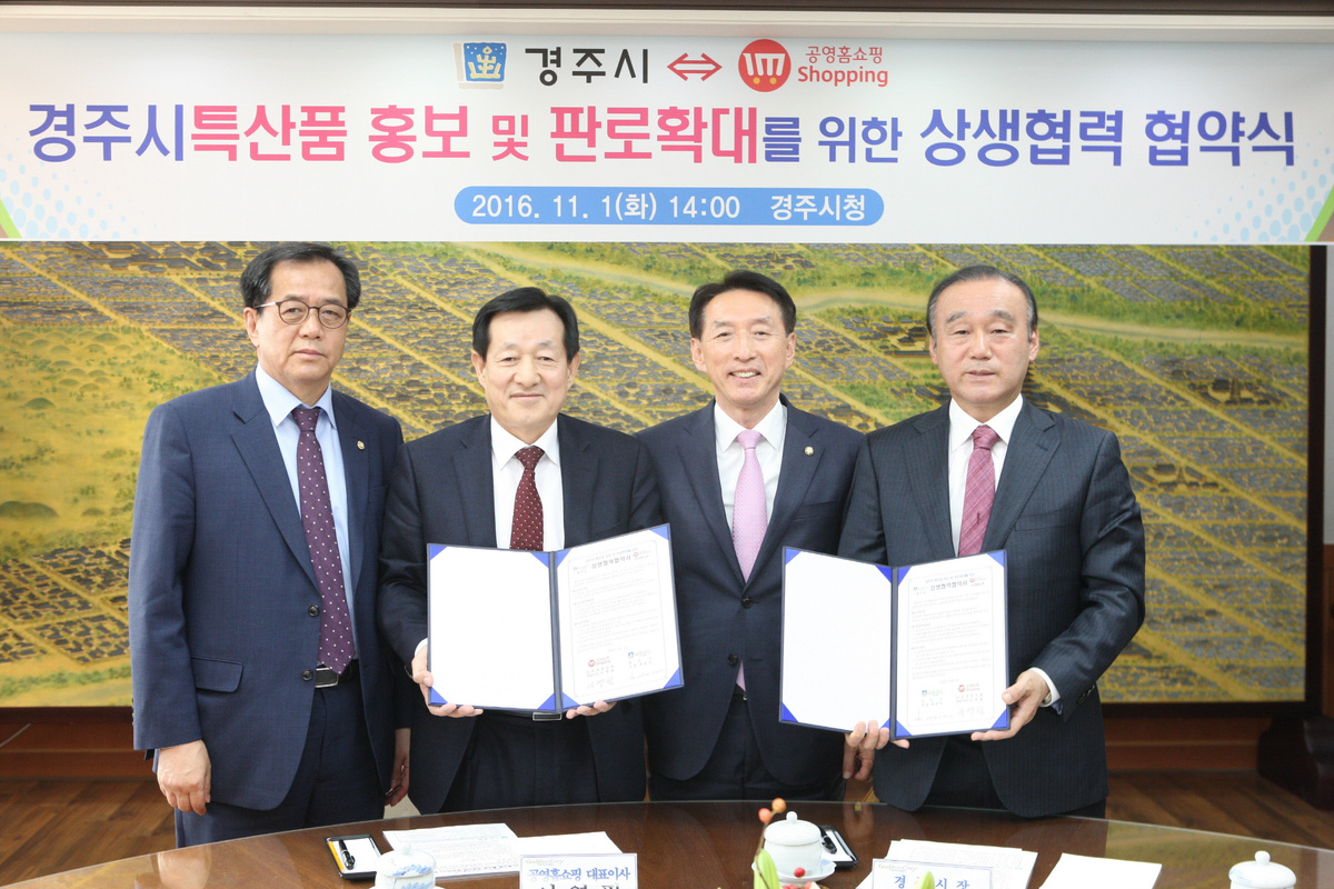 [이재영 기자]= 경주시는 1일 대외협력실에서 ㈜공영홈쇼핑(대표 이영필) 간 지역의 우수 농수산 특산품 및 중소기업 우수제품 홍보 및 판로 확대를 위해 공영홈쇼핑 방송지원 상생협약을 체결했다.