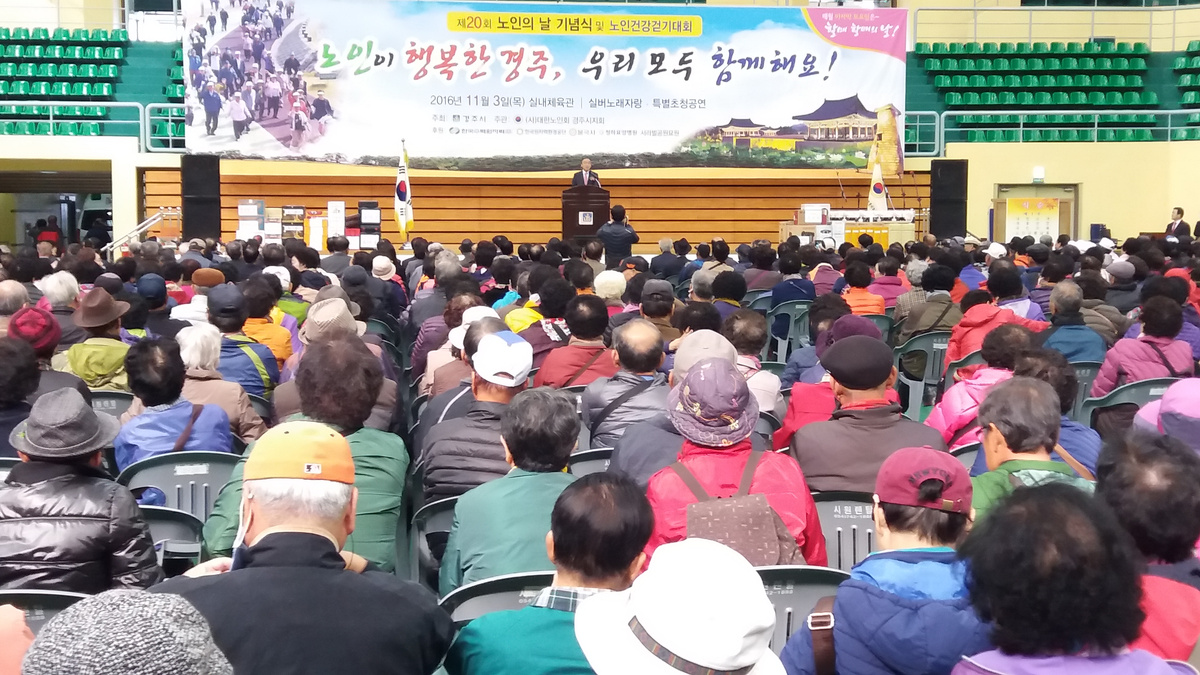 [이재영 기자]= 경주시가 주최하고 (사)대한노인회 경주시지회(지회장 최임석)가 주관하는 제20회 노인의 날 기념식 및 건강걷기대회가 3일 황성공원 실내체육관에서 지역 어르신 3,000여명이 참석한 가운데 성황리에 열렸다.