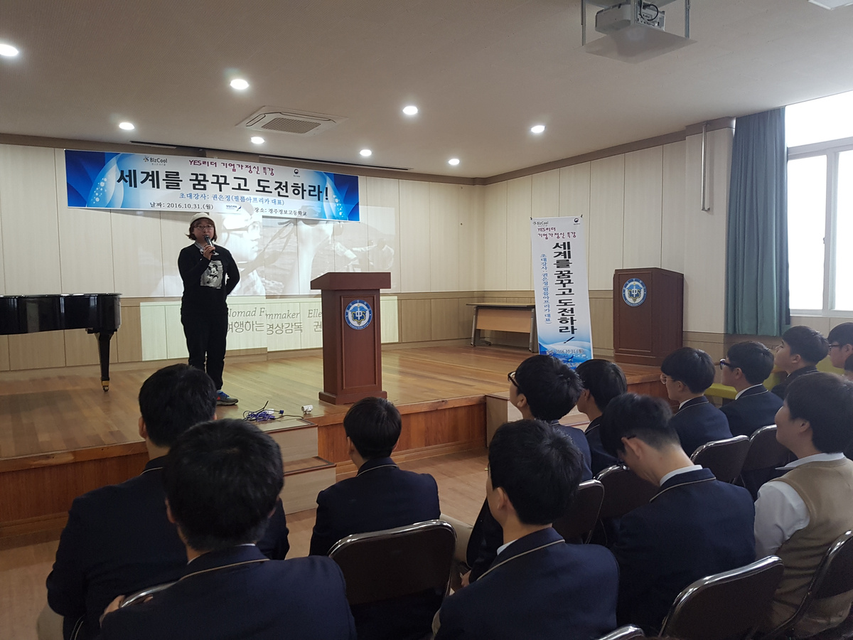 [이재영 기자]= 경주정보고등학교(교장 김도현)는 지난달 31일 교내 한빛관에서 학생들 80여명을 대상으로 청년창업가인 필름아프리카 권은정 대표를 초청하여 ‘세계를 꿈꾸고 도전하라’라는 주제로 학생들의 창업가정신 및 기업가정신 함양을 위해 예스리더스특강을 개최했다.