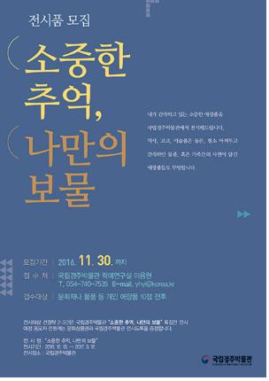 응모 점수는 1점에서 여러 점 모두 가능하며 응모한 애장품 가운데 3∼4건을 선정하여 내달 13일부터 내년도 3월 12일까지 국립경주박물관에서 특집전 “소중한 추억, 나만의 보물”을 특집전을 개최한다.