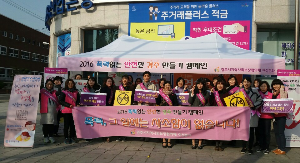 지역사회보장협의체와 경주시 아동·여성안전지역연대가 주관하여 아동과 여성이 안전하고 성폭력·가정폭력·학교폭력 없는 안전한 사회 만들기 선언문 낭독과 거리 행진, 홍보물 배부, 서명 운동 등을 전개했다.