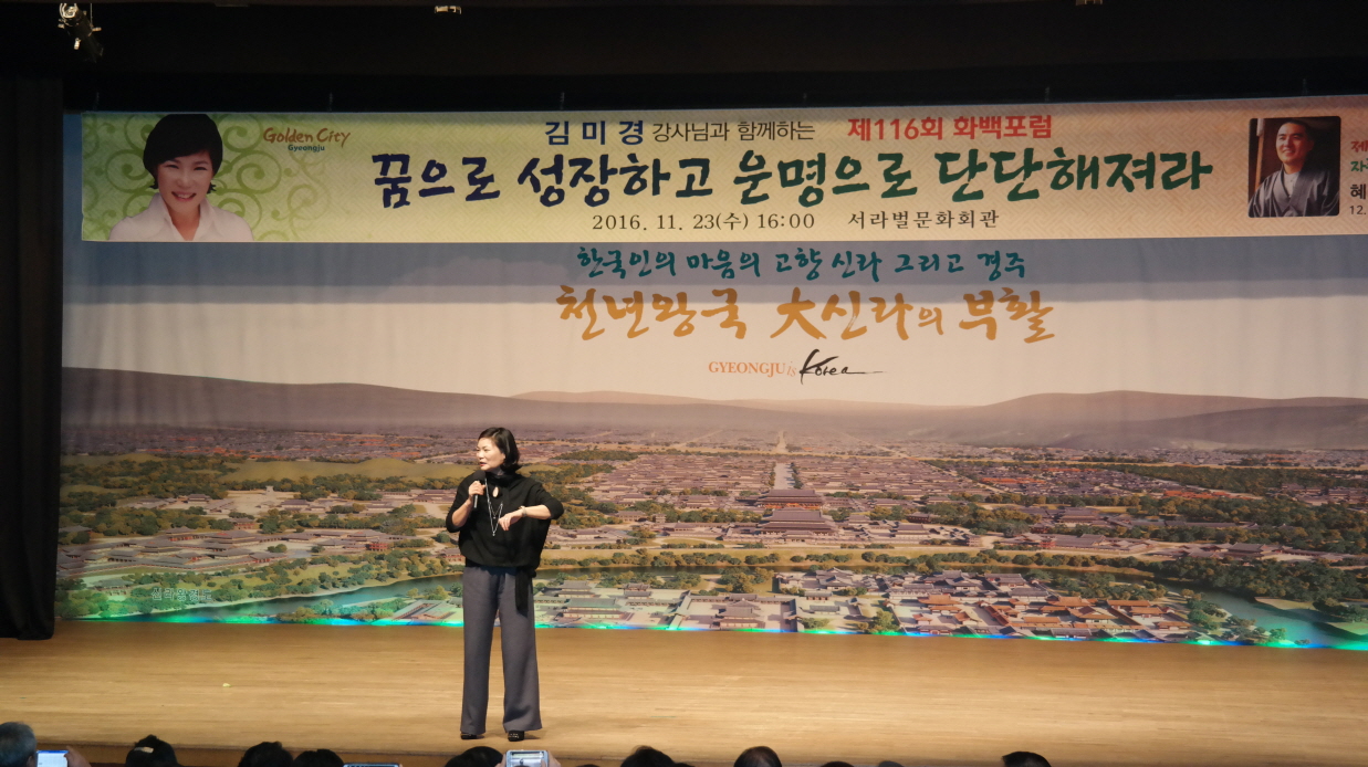 [이재영 기자]= 경주시는 제116회 화백포럼을 23일 서라벌문화회관에서 W.lnsights 대표 김미경 강사의 '꿈으로 성장하고 운명으로 단단해져라'라는 주제로 개최했다.