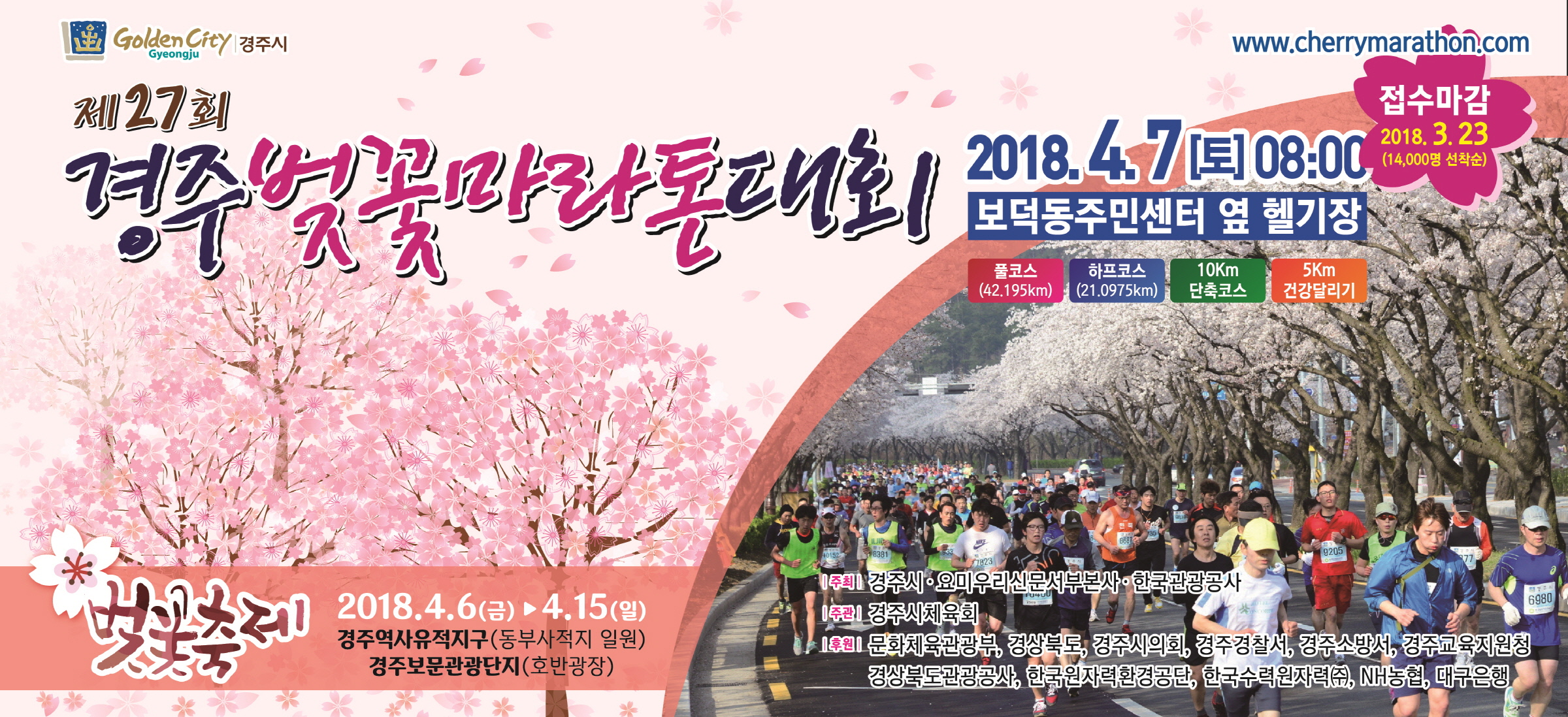 경북 경주시와 일본 요미우리신문 서부본사, 한국관광공사가 공동 주최하고 경주시체육회가 주관하는 ‘제27회 경주벚꽃마라톤대회’가 4월 7일 보문단지 내 보덕동주민센터 앞을 출발해 2천년 역사도시를 달리며 벚꽃보다 더한 장관을 연출한다.