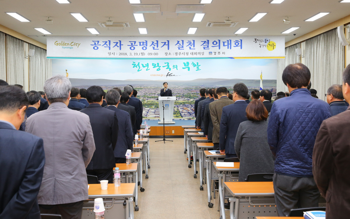 [이재영 기자] 경주시(시장 최양식)가 19일 대회의실에서 오는 6월 13일 실시되는 제7회 전국동시지방선거에서 공무원의 솔선수범을 통한 선거법 준수 분위기를 조성하기 위해 ‘공직자 선거중립 결의대회’를 가졌다.