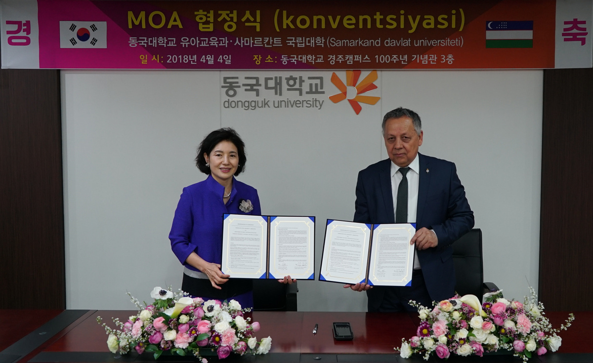김혜순 유아교육과 학과장을 비롯한 동국대 유아교육과 교수와 학생, 국립 사마르칸트대학교 부총장 일행 등 20여명이 참석한 가운데 진행된 이번 체결식은 지난해 11월 우즈베키스탄 샤브카트 미르지요예프 대통령이 유아교육학부를 신설하면서 한국의 유아교육시스템을 도입하라는 지시와 이에 따른 사마르칸트 국립대학 측의 적극적인 요청에 의해 이루어진 것이다