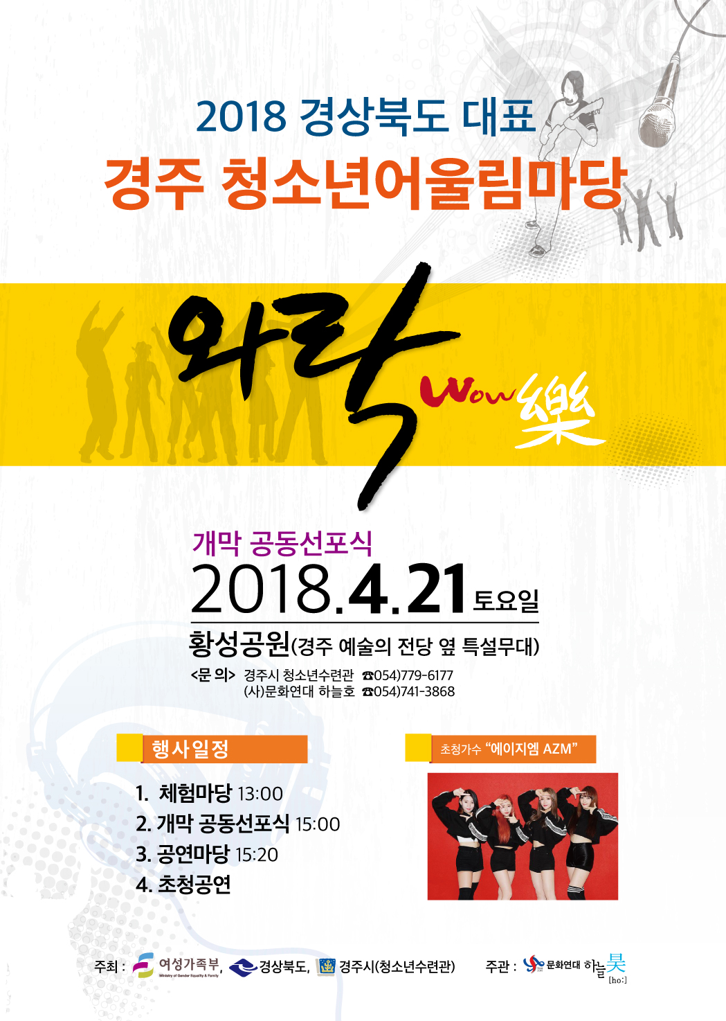 [이재영 기자] 경주시에서 오는 21일 오후 1시부터 경상북도 청소년들이 주도적으로 참여하여 만들어가는 경북 청소년문화의 대향연, ‘2018 경상북도 대표 경주청소년어울림마당’을 경주예술의전당 옆 특설무대 일원에서 선포식과 함께 개막한다.