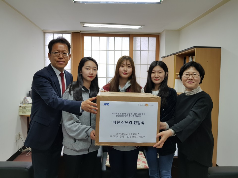 이번 전달식은 동국대 경주캠퍼스 2018년 신입생 120여명을 대상으로 한 역량 강화 캠프 중 인성교육의 일환으로 진행된 ‘착한 장난감 만들기 캠페인’에 참가한 학생들이 완성한 장난감을 한코리아에 전달하기 위해 개최됐다.
