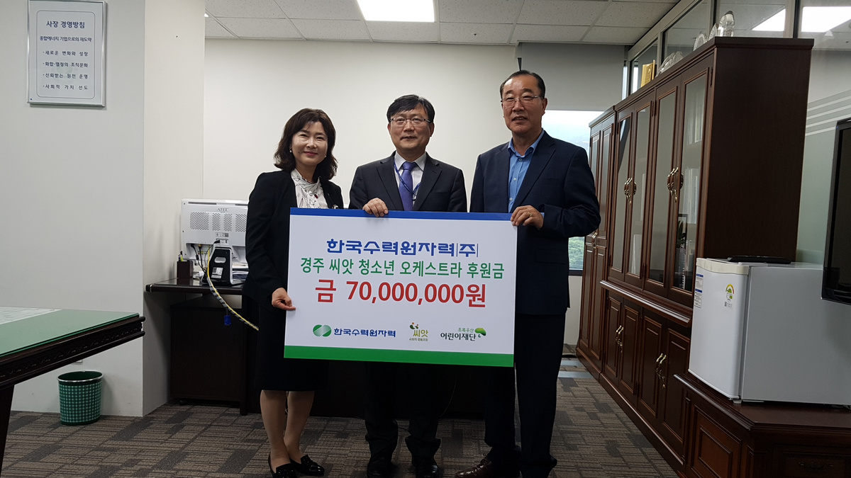 후원금 전달식은 2일 오후 한수원 본사에서 윤상조 한수원 지역상생협력처장과 조문호 씨앗청소년 오케스트라 단장, 김창연 초록우산어린이재단 경북지역본부장 등이 참석한 가운데 열렸다.
