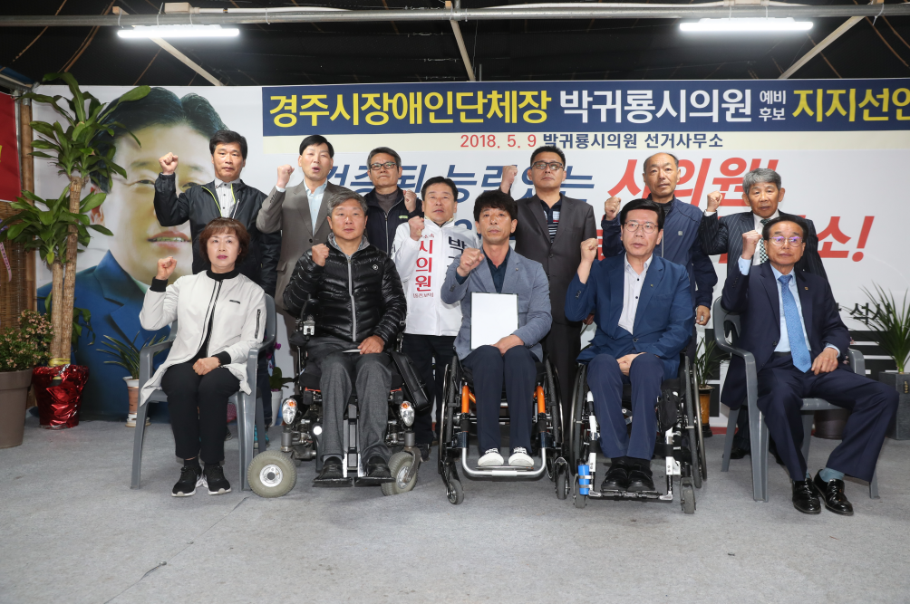 이날 지지 선언에서 1만6천여 경주시등록장애인을 대변하는 경주시 장애인단체일동은 "이번 전국동시지방선거 경주시의원 다 선거구(동천동, 보덕동)에 출마한 박귀룡의원이 자유한국당의 공천에서 장애인에 대한 특별한 배려는 차치하고 공정한 기회조차 주어지지 않고 배제된 것에 실로 납득이 되지 않으며 유감으로 생각한다"고 말했다.