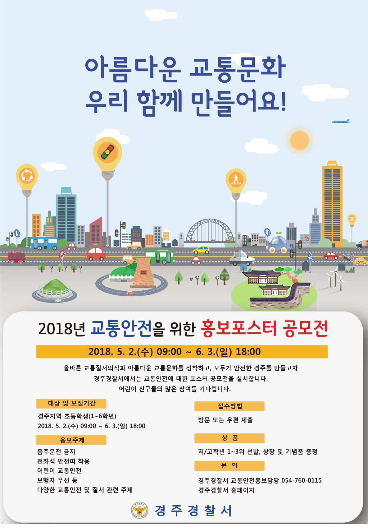 [이재영 기자] 경주경찰서(서장 배기환)는 어린이 대상 교통질서 의식을 향상시키고, 교통안전의 중요성을 강조·홍보하기 위해 어린이 대상 교통안전 홍보포스터 공모전을 실시한다.