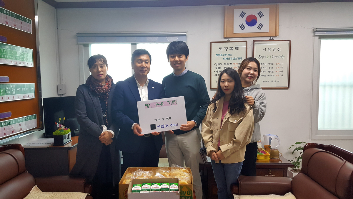 [이재영 기자] 경주시 황남동 내 위치한 카페 아덴(A den, 대표 윤홍규)에서 9일 황남동 주민센터(동장 정주용)를 방문해 관내 어르신들에게 전달해 줄 것을 부탁하며 빵과 우유 각 300개(150만원 상당)를 기탁했다.