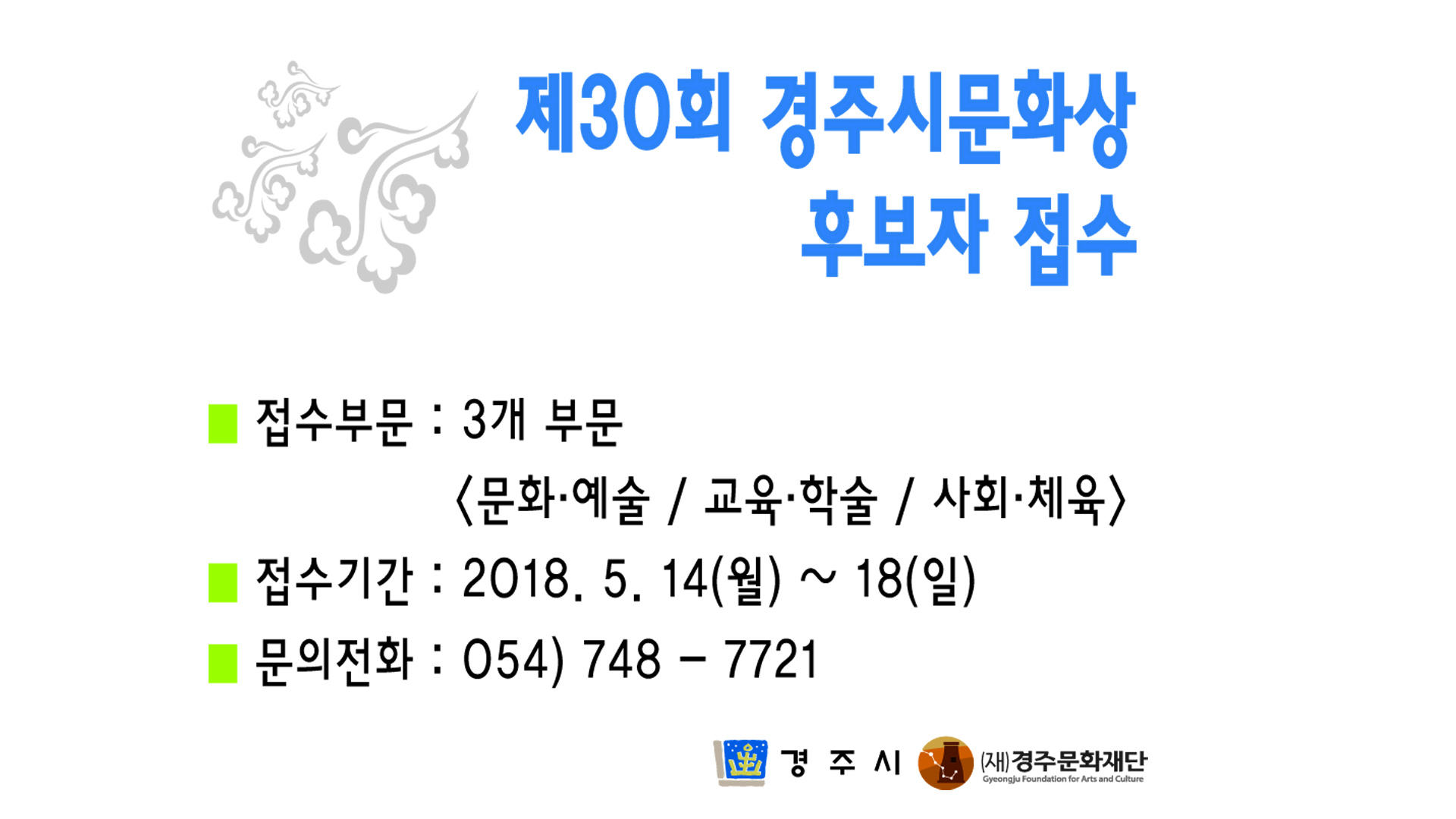 자세한 문의는 경주시청 문화예술과(054-779-6073), 경주문화재단 문화사업팀(054-748-7721)으로 할 수 있다.