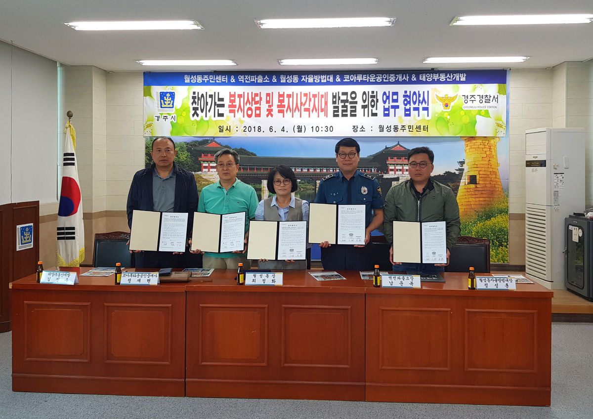 월성동 주민센터에서는 4일 주민센터 회의실에서 역전파출소(소장 남운복), 월성동 자율방범대(대장 정성훈), 태양부동산개발, 코아루타운공인중개사와 함께 복지사각지대 발굴 업무 협약식을 가졌다.