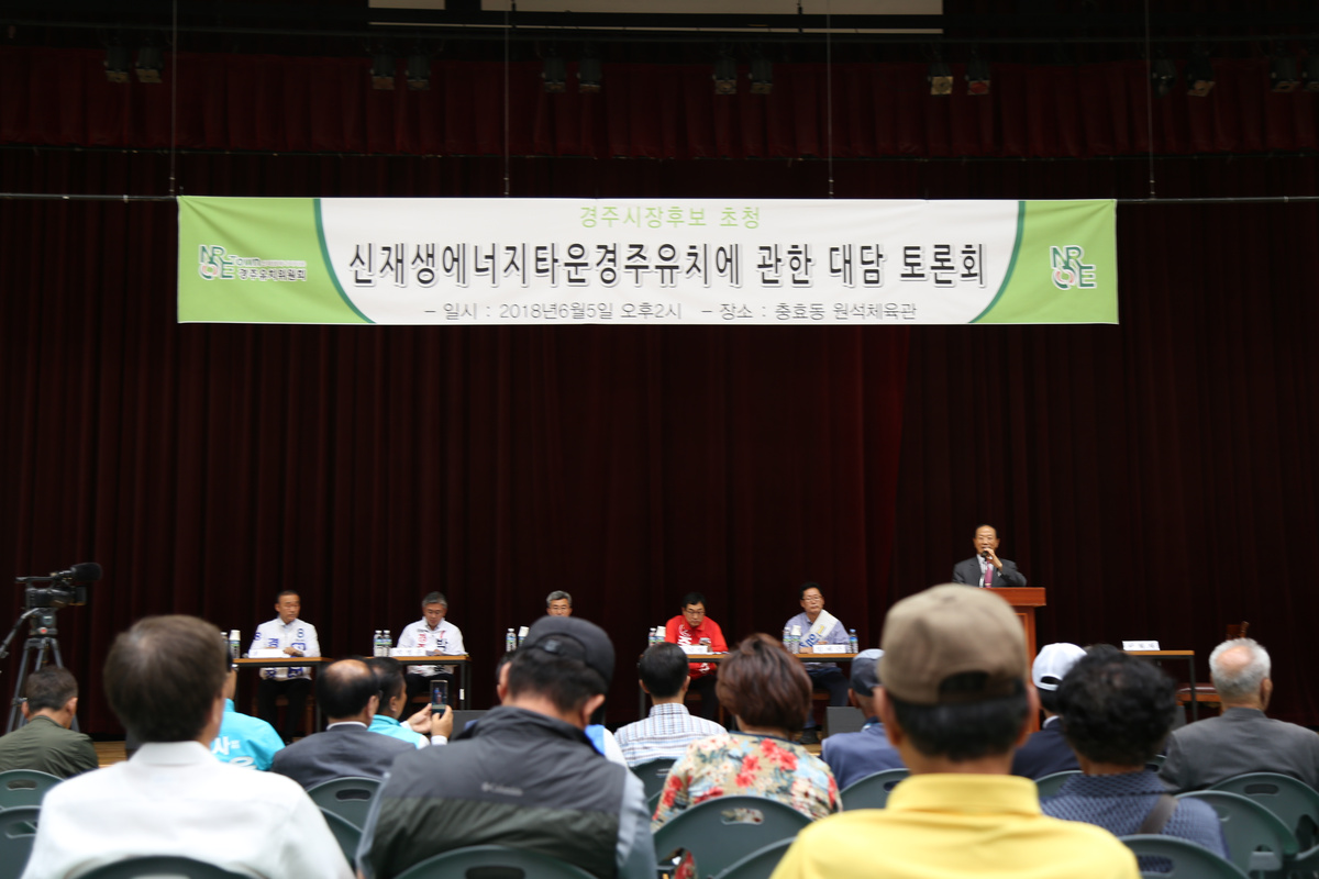 토론의 주제는 신재생에너지 융복합타운 유치에 관한 후보자들의 의견과 공약 이였으며, 부제로 시민들이 궁금해 하는 경주시 현안에 대한 질문 5가지 정도로 각 후보의 발언을 들었다. 경주왕경복원문제, 경주 인구감소 대책문제, 경주역폐철로 부지활용방안 등. 경주시가 안고 있는 현안들에 대해서 각 후보들은 의견을 쏟아 내었다.