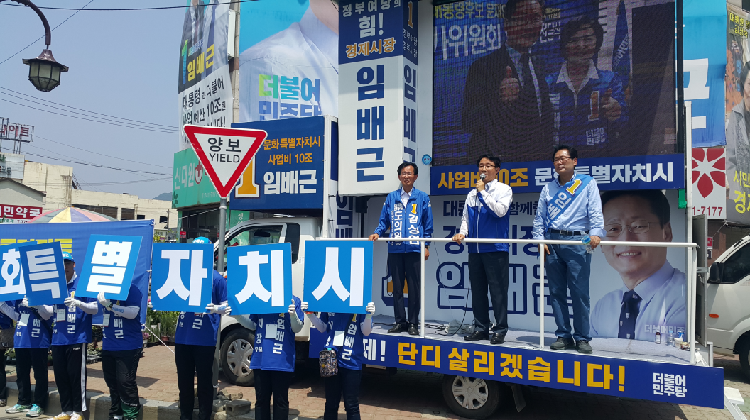 그런 부상투혼의 지원유세는 여기서 끝나지 않고 중앙시장과 성동시장으로 이어졌다. 조정식 의원과 임 후보는 상인들과 시민들의 손을 잡으며 경주의 서민경제를 살리기 위한 절호의 기회이고 그 일을 할 수 있는 적임자인 힘 있는 정부여당 후보 임배근을 지지해줄 것을 호소했다.