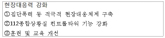 이번 모의 훈련은 지난 4월 30일 광주에서 발생한 집단폭력 사태로 인해 적극적인 장구사용 및 제압 등 강력대응을 원하는 국민 눈높이를 반영해 개선된 집단폭력 대응 시스템을 적용한 훈련으로 개선된 집단폭력 대응 시스템은 크게 현장대응력 강화와 법. 제도 정비로 구분되며 일선 현장에서는 국민들의 불안감을 해소하기 위해 현장 대응력 강화에 초점을 맞춰 이뤄져 있다.