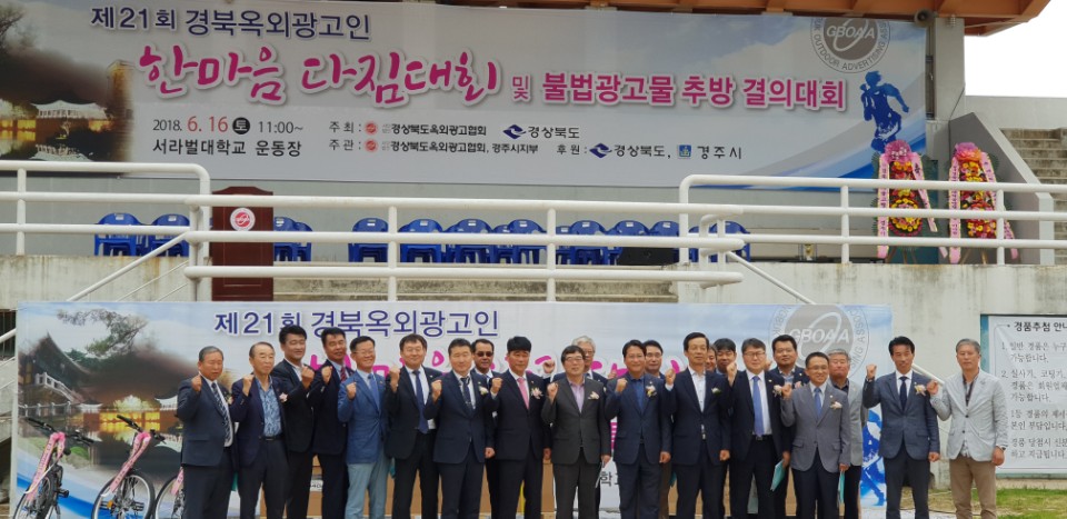 [이재영 기자] 경주시에서 경북옥외광고인들의 화합과 옥외광고산업 진흥을 위한 ‘제21회 경북옥외광고인 한마음다짐대회 및 불법광고물 추방결의대회’가 지난 16일 서라벌대학교 운동장에서 열렸다.