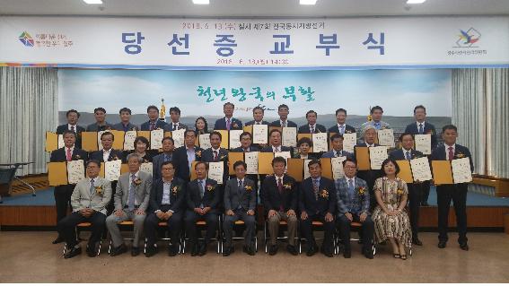 [이재영 기자] 경주시선거관리위원회(위원장 백정현)는 6. 13. 실시한 제7회 전국동시지방선거와 관련하여 경주시장 및 경상북도의원, 경주시의원 당선자를 대상으로 18일(월) 오후 2시 경주시청 2층 대회의실에서 '제7회 전국동시지방선거 당선증 교부식'을 개최했다.