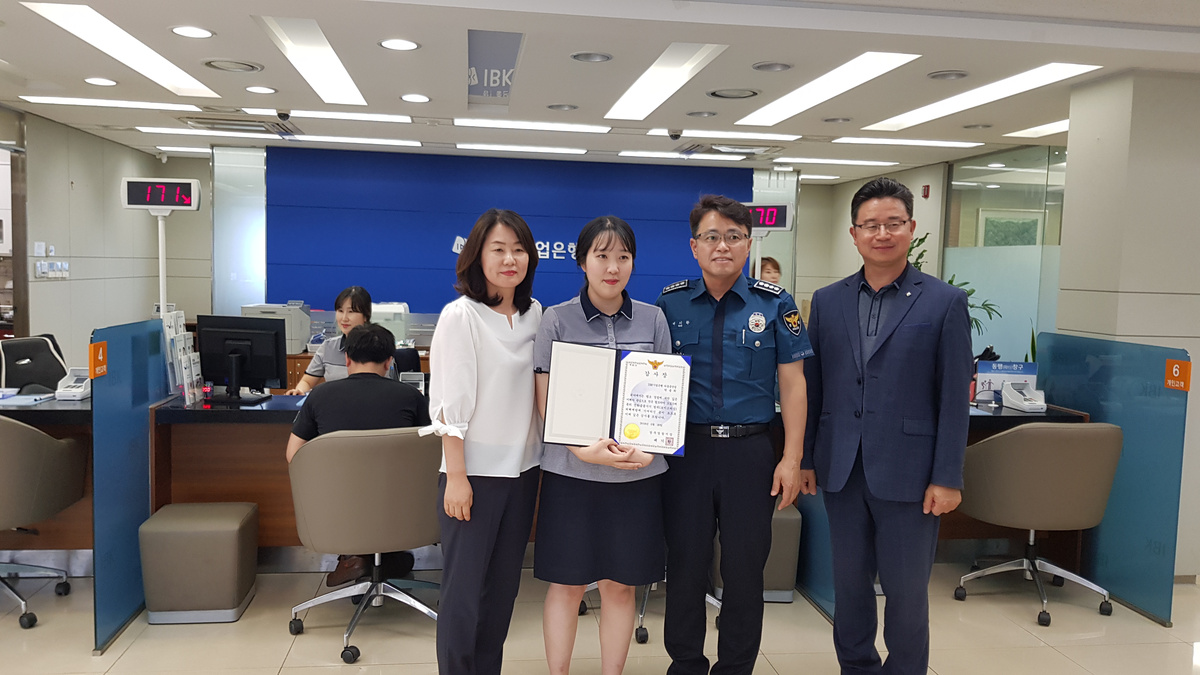 지난 8일 은행원 박송희 대리는 평소 고객 한명이 금융거래 실적이 없는데도 4월 말경부터 계좌송금 한도를 터무니 없이 올리는 것을 수상히 여겨 해당 계좌를 범죄 의심계좌로 등록시킨 뒤 모니터링을 하던 중 계좌 명의자가 위 지점을 방문하여 자신의 계좌에 입금된 보이스피싱 피해금을 또다른 보이스피싱 계좌로 송금하려던 것을 즉시 경찰에 신고하여 피해를 막았다.