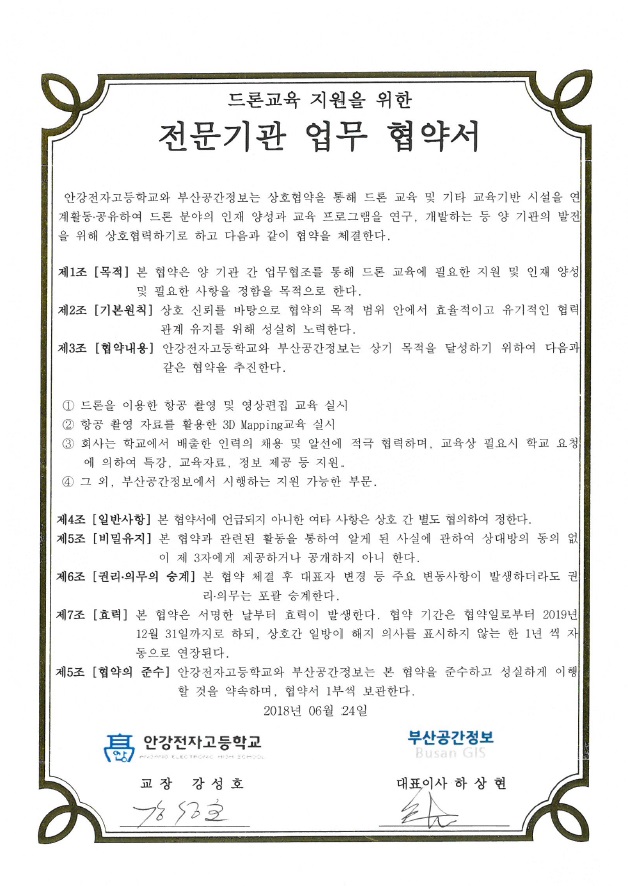 안강전자고. 부산 공간정보 `드론교육 지원` 업무협약 체결