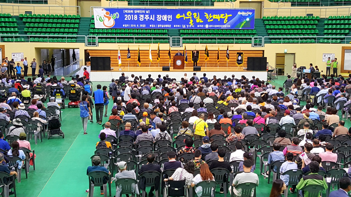 [이재영 기자] 경주시에서는 29일 경주시장애인단체협의회 주관으로 황성공원 실내체육관에서 10개 장애인단체 회원들을 비롯한 장애인 가족, 자원봉사자, 후원자 등 1,000여명이 참석한 가운데, ‘2018 경주시 장애인 어울림 한마당’ 행사를 가졌다.