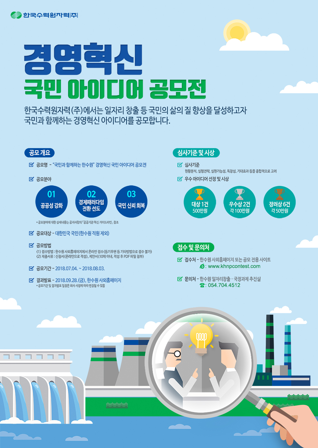 한수원은 ‘경영혁신 국민 아이디어 공모전’을 개최하고, 한수원 혁신 추진 과정에 국민의 의견을 수렴, 정책에 적극 반영한다는 계획이다.