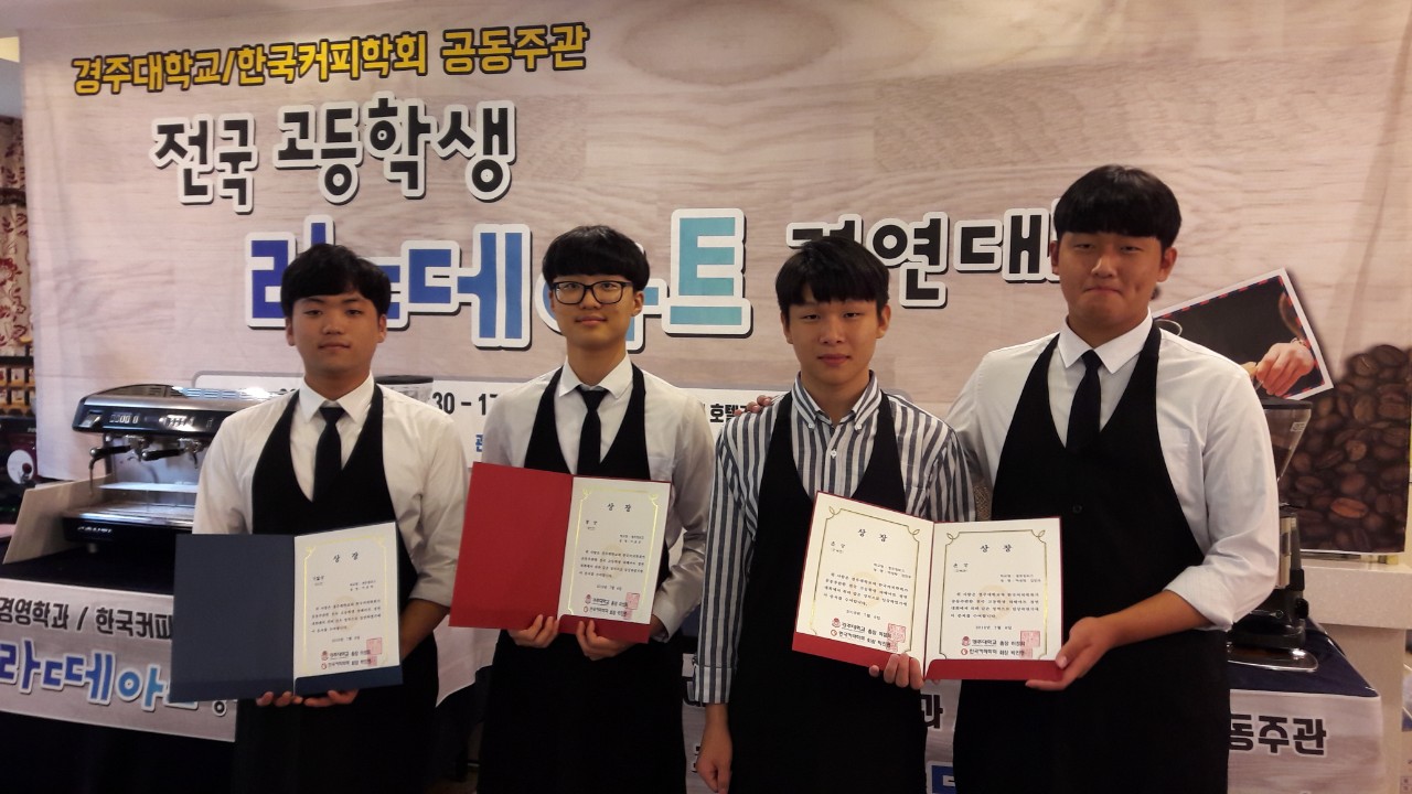 경주대, 한국커피학회 공동 주관으로 개최된 이번 대회에서 경주정보고 창업동아리 바리향(지도교사 김경아) 학생 4명이 참가해 단체전에 출전한 김민우(2학년), 하성재(2학년)군이 은상, 개인전에 출전한 이준호(2학년) 군이 동상, 이준혁(3학년)군이 기술상을 수상하는 기쁨을 누렸다.