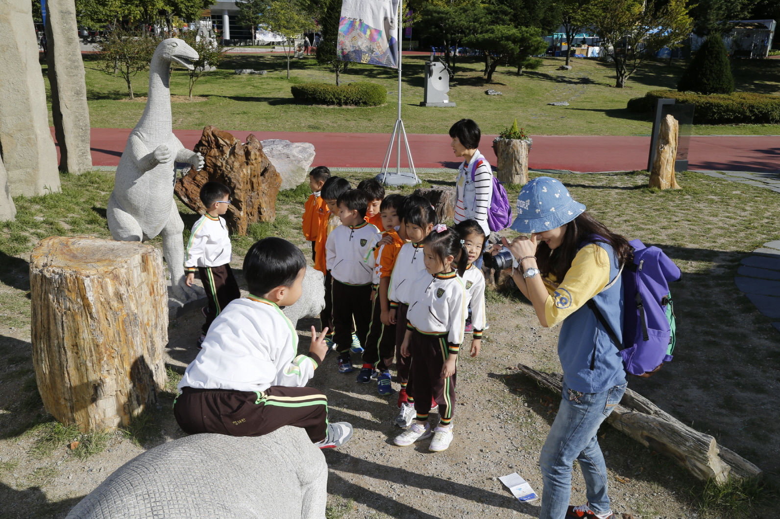 | ↑↑ 쥬라기로드 앞 공룡모형을 타고 사진을 찍고 있는 어린이들 |