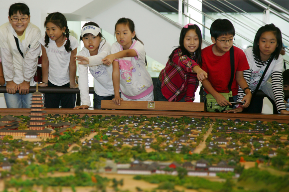 | ↑↑ 신라문화역사관에서 왕경모형을 보고 있는 어린이들 |